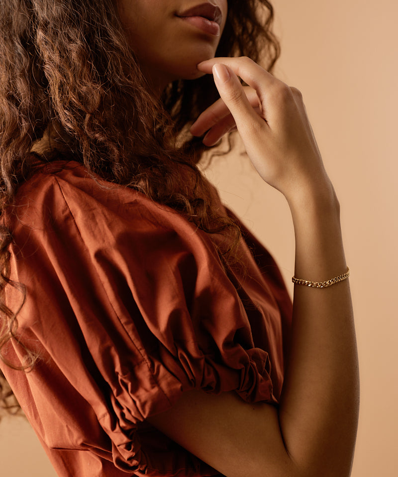 Bring a hint of golden glamour to your look with this shimmering, skin-friendly bracelet. Crafted from high-quality stainless steel (316L) and finished with a durable coating developed in consultation with dermatologists, it’s gentle on even the most sensitive skin. Perfect for daily wear, this Swedish-made Blomdahl piece combines style, comfort, and quality — with every step of production fully controlled and documented.